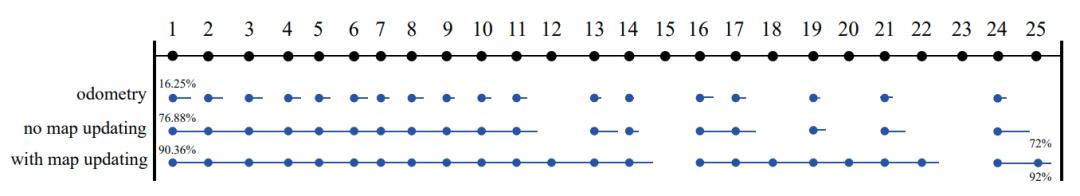 表1给出了执行了25次定位任务和地图更新,分别比较了纯里程计、无地图更新、地图更新三种情况下的定位性能,对于每次定位,蓝点表示初始化成功,蓝线的长短表示定位任务执行的里程数,中间间断表示定位丢失。表中左侧百分号指标为正确轨迹的里程比值(参考论文中MRCL,通过激光与地图匹配情况计算获得),右下侧为初始化成功率(参考论文CRI,通过统计初始化成功次数获得),可以看到开启地图更新后,定位精度和定位丢失概率相对于未开启地图更新得到显著提高。