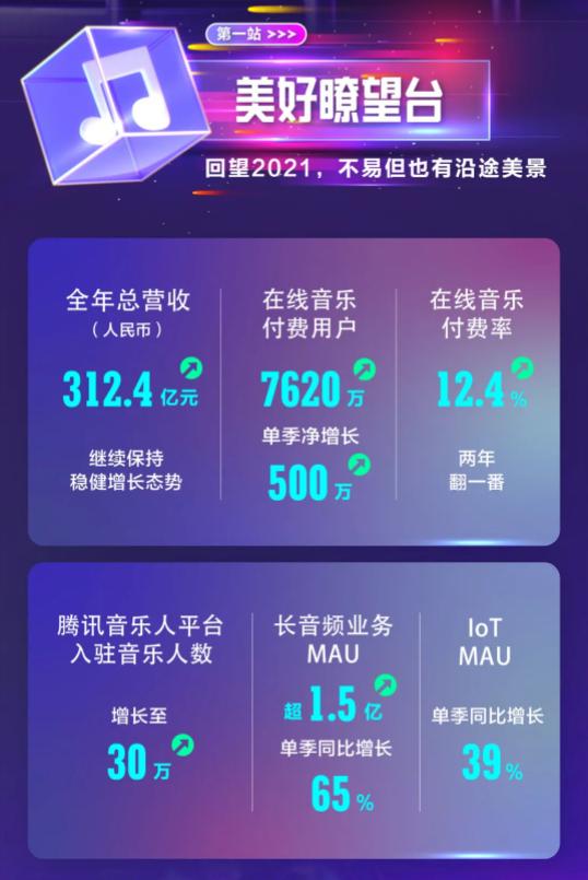 据财报显示,腾讯音乐2021年第四季度及全年整体业绩持续稳健增长,总营收、公司调整后净利润等多项核心数据达到乃至超过市场预期水平,在线音乐付费用户达到7620万再创新高,在线音乐付费率超12%,多项业务再获新突破。