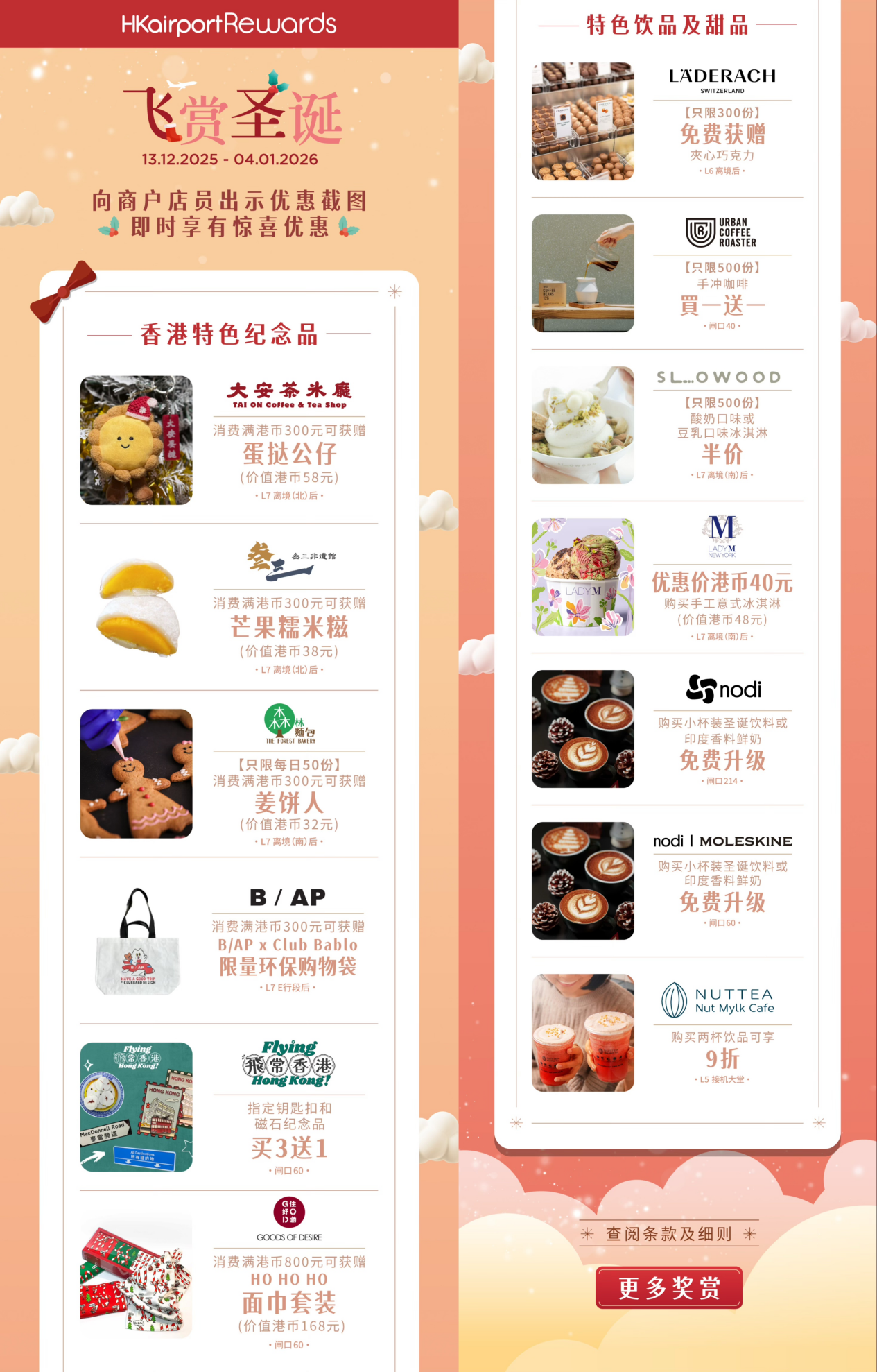 圣诞跨年期间,香港机场官网上线了飞赏圣诞专页,13家人气店铺参与活动,解锁福利的方式超简单:付款前向店员出示专页优惠截图+HKairport Rewards会员版面,就能轻松省下一笔,让每一份心意都更具性价比。