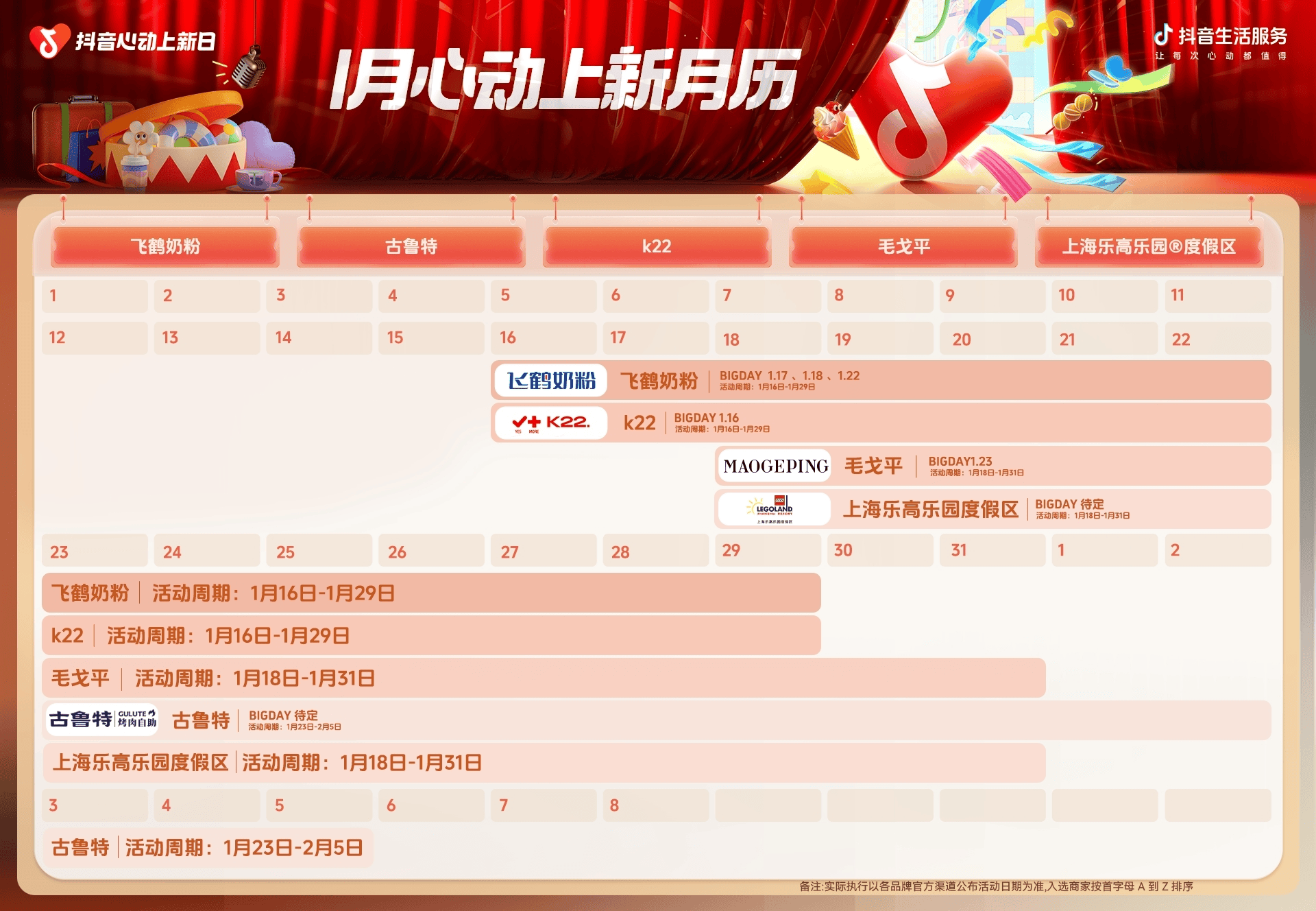 新年伊始,新的消费计划也提上日程。无论是备年货,还是挑新礼,关于“买买买”的小心思,在1月总是格外引人关注。「抖音心动上新日」与「抖音心动大牌日」两大IP将携手好想来零食乐园、一汽奥迪、vivo、飞鹤奶粉、上海乐高乐园®度假区、毛戈平、K22.酸奶、古鲁特、喜茶、华润万家、途牛等多行业的品牌伙伴,把大家的共同期待,变成一场贯穿线上线下联动的开年精彩体验,让大家在准备新年时,也能发现乐趣、收获惊喜。