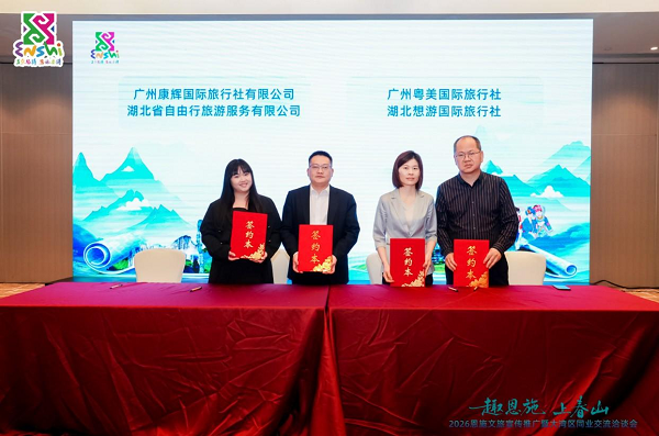此次同业交流洽谈会精准对接供需、高效促成合作,一系列务实合作成果现场落地。湖北省自由行旅游服务有限公司、湖北想游国际旅行社、恩施巴楚国际旅行社、恩施玖辰国际旅行社分别与广州康辉国际旅行社有限公司、广州粤美国际旅行社、光明国旅(广州)、广东精彩假期旅行社签署了战略合作协议。根据协议,双方将在市场开拓、产品对接、游客互送、政策落地、宣传联动等方面,建立长期友好合作关系,推动“引客入恩”走深走实。